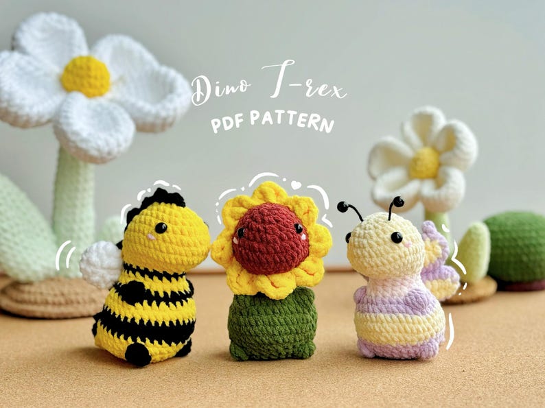 Sunflower Dinosaur No Sew Crochet Pattern, Butterfly Dinosaur Crochet Pattern, Bee-rex Crochet Pattern